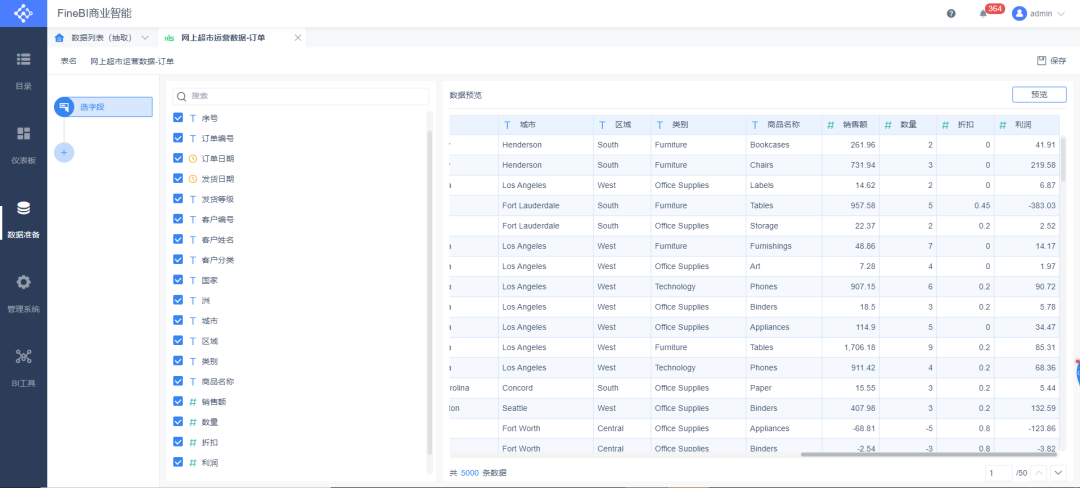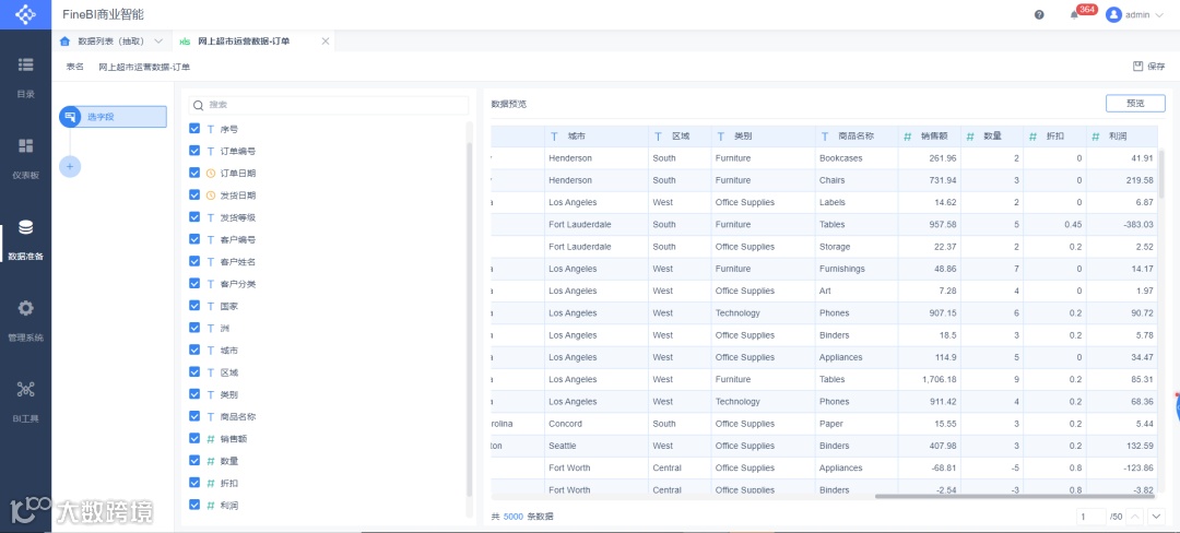 数据来源于某数据产品内置数据库的网上超市经营数据(美国),整个过程包括了解释翻译字段,选择分析字段,删除重复数据,删除无效数据,一致化处理等。最终结果如下。
