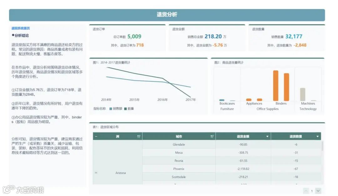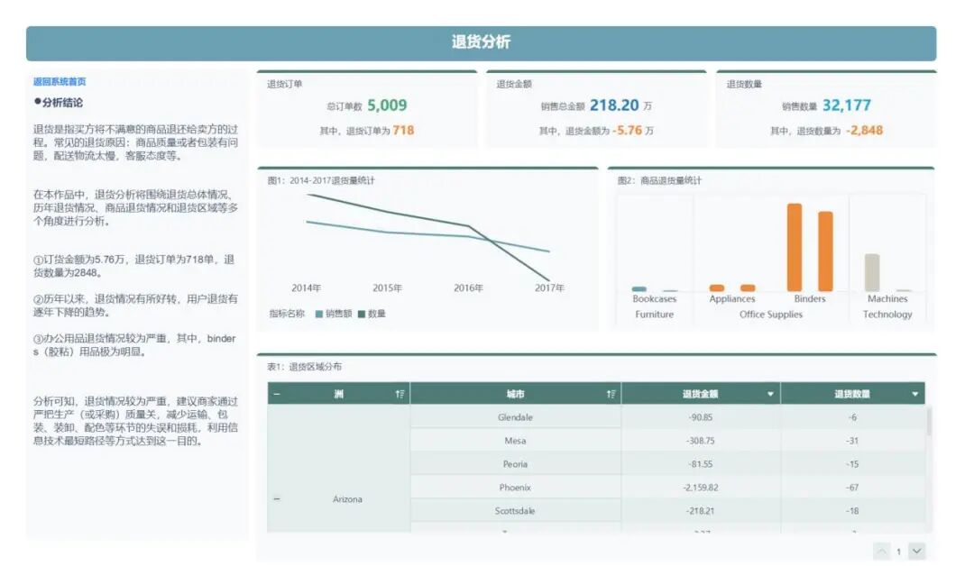 在本作品中,退货分析将围绕退货总体情况、历年退货情况、商品退货情况和退货区域等多个角度进行分析。