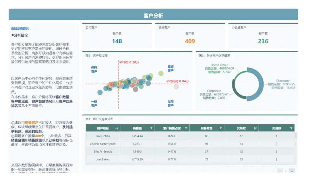 ②普通客户数量409个,占比最多;且其销售金额和销售数量以及订单数等指标也最多,应该作为重点关注和维护对象。