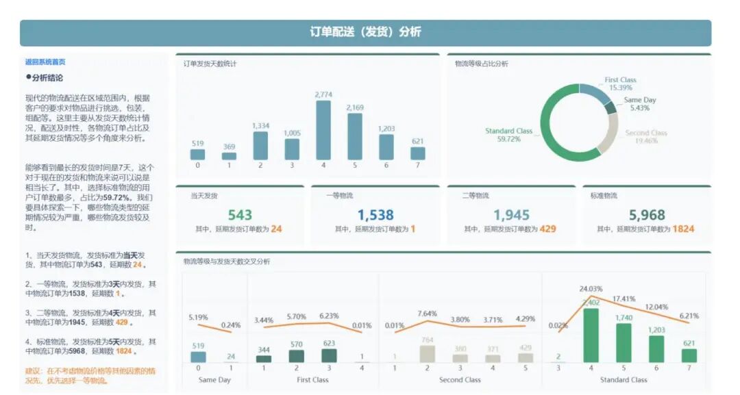 数据分析结果显示,除了一等物流,其他类型的物流发货延期较为严重;建议相关工作人员注意监控发货的及时性,同时在不考虑其他因素的情况下推行一等物流,避免因为延期发货而造成的退货现象发生。