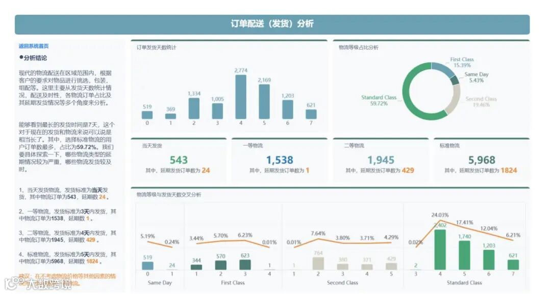 作品的内容包括了6个分析专题,其中这6个分析专题包括了整体核心指标、配送、商品、利润、退货和客户等内容。主要分析内容概述如下: