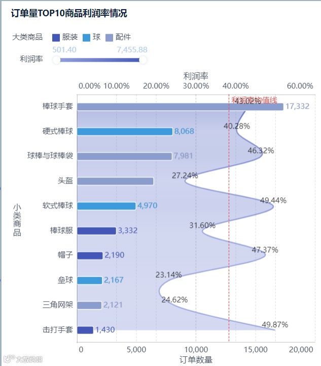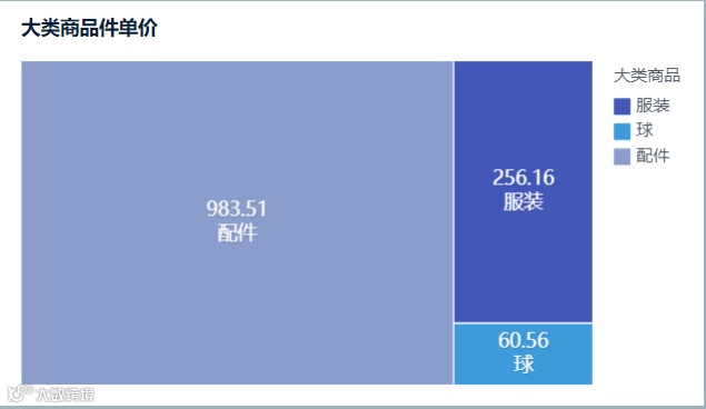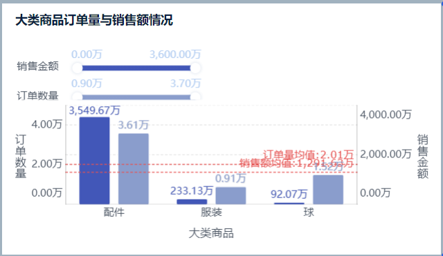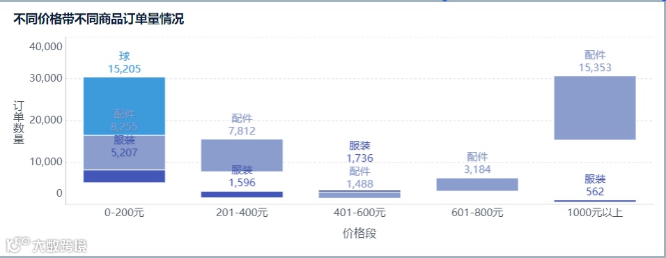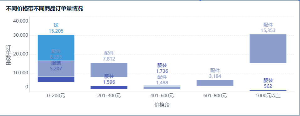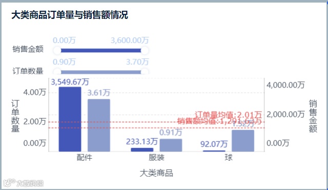 结合上下两幅数据图,商品单价与销售金额呈现正相关,且配件类商品单价与订单数量都远超服装、球类商品,因此其销售额也最高;若需带动销售总额的增长,可初步考虑提高后两类商品订单量。