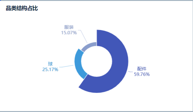 从品类结构占比来看,配件类商品销售占比高达59.76%,球类与服装类商品分别占25.17%、15.07%,客群需求集中度明显,主要以配件类商品为主,服装类商品需求较低。