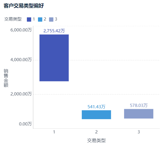 从上图可知,客户喜好交易类型为1,使用该交易类型的销售金额达到2755.42万元,是其余两种交易类型销售金额的近5倍。
