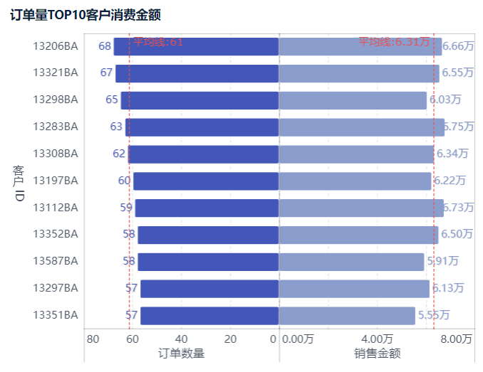 该企业客户只要来源于东南区,其余地区客户数差距较小。从18484位客户中筛选出订单量前10的客户进行分析,统计出前10位客户的平均订单量在61件,平均消费金额达到6.31万元,消费金额进一步反映出其消费能力和消费意愿。