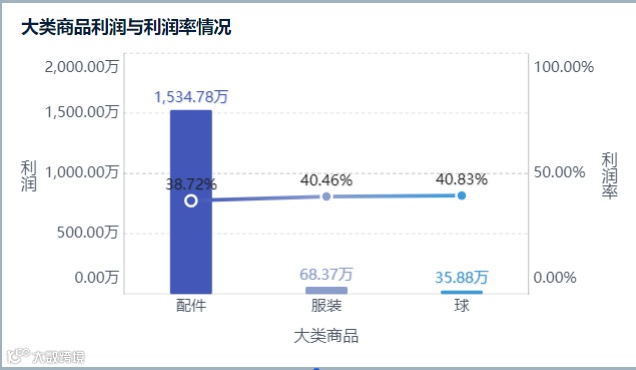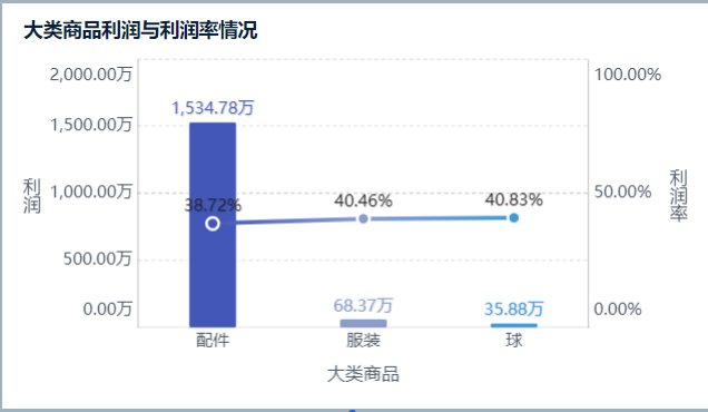 数据统计,配件类商品利润仍占据第一,但从商品利润率来看,配件类商品利润率则较低,利润率低于40%,反之后两类商品的利润率则高于40%。因此,提高总利润的关键策略之一同样在于提高服装、球类商品的销量,从而逐步实现利润的最大化。