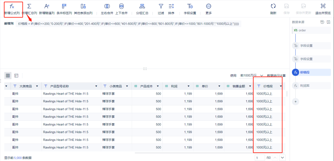 新增列:为后续从商品维度对其展开价格分析,现根据表中“单价”列数据新增公式列,使之生成相同范围的多个价格段。价格段=IF((单价)<=200,"0-200元",IF((单价)<=400,"201-400元",IF((单价)<=600,"401-600元",IF((单价)<=800,"601-800元",IF((单价)<=1000,"801-1000元","1000元以上")))))