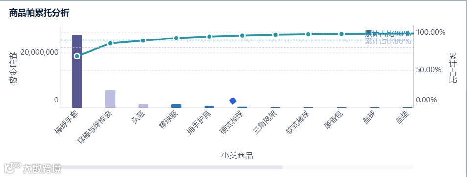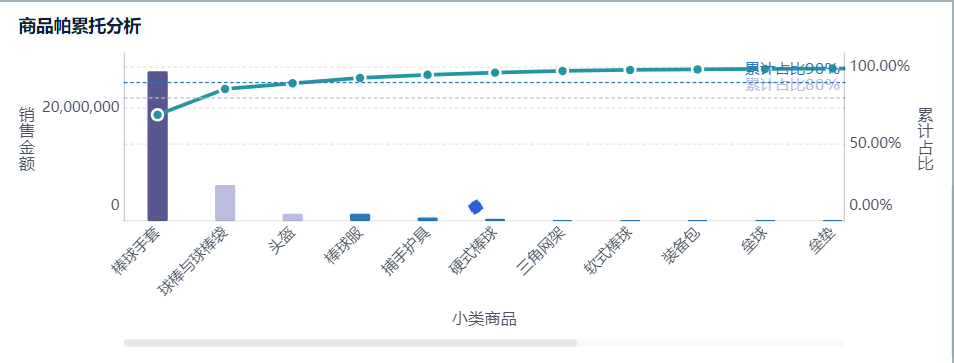除了关注商品利润率之外,商品的价格同样是销售过程的关注点。对于一个品类来讲,价格线不必过多。从上图可知,球类商品集中在低价格段,且仅有一个价格段,反之配件类商品则在各价格段中均有销售,因此,可适当减少个别价格段商品,消费者在选择中,也可以减少混肴,便于挑选。