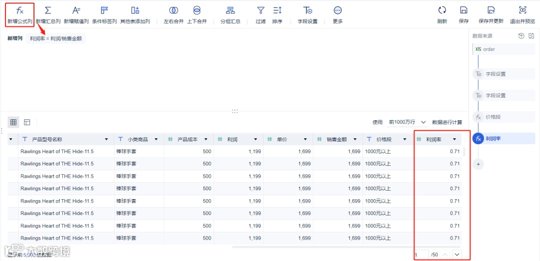 新增列:什么是好指标?一份数据中的好指标是核心驱动指标,即比例或比率。因此,根据现有的“利润”列、“销售金额”列,新增公式列为“利润率”,帮助更好地分析企业或商品的盈利水平。