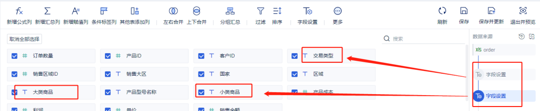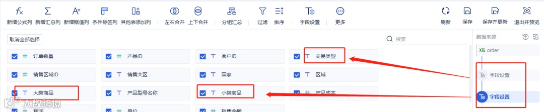 字段设置:数据类型转换,将数值型“交易类型”字段转换为文本型。修改字段名称,将原数据表中的“产品类别”修改为“大类商品”、将“产品名称”修改为“小类商品”,便于后续对商品进行品类结构分析。