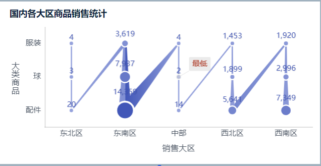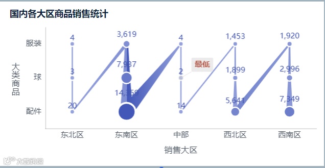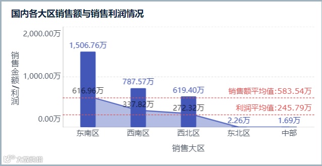 数据统计,东南、西南、西北三大区销售金额均高于平均值,销售数据可观,判断为高销大区。其中东南区销售金额与利润均为最高,销售金额高达1506.76万元,利润达到611.96万元,相较于第二名西南区高出近2倍。反观东北区及中部地区的销售情况,两大区销售额合计不足5万元,销售异常,判断为低销大区,需进一步追踪核查。