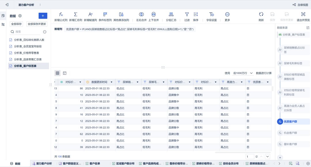 取客户标签表新增列【非高潜力会员人数】,=目标会员购买流通奶粉人数-高潜力会员人数。 -
