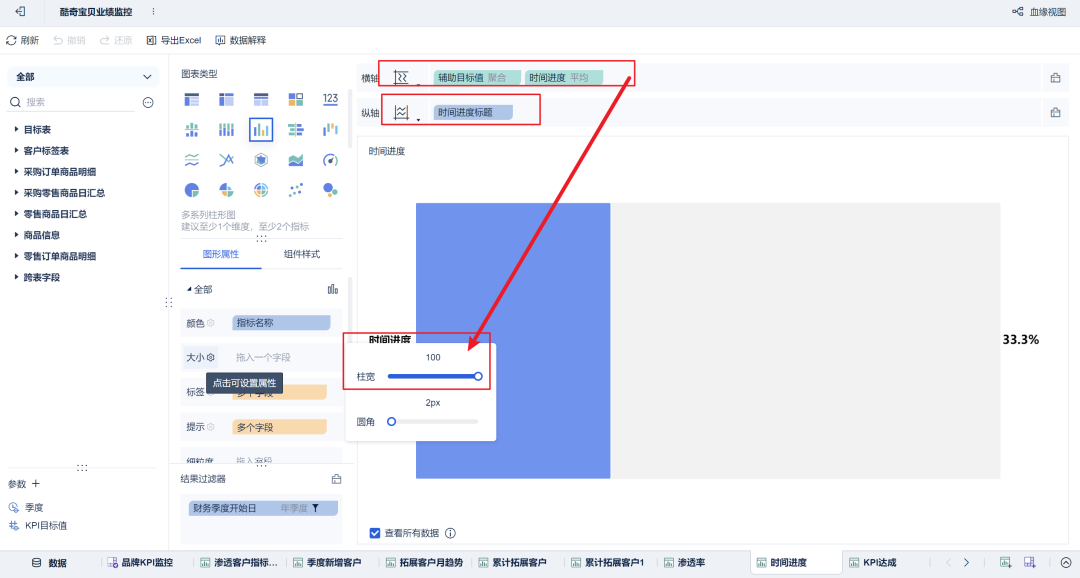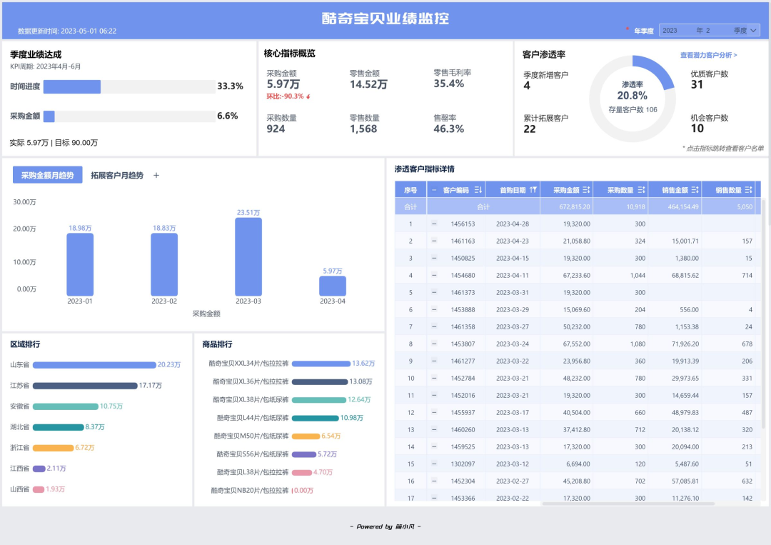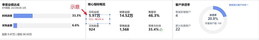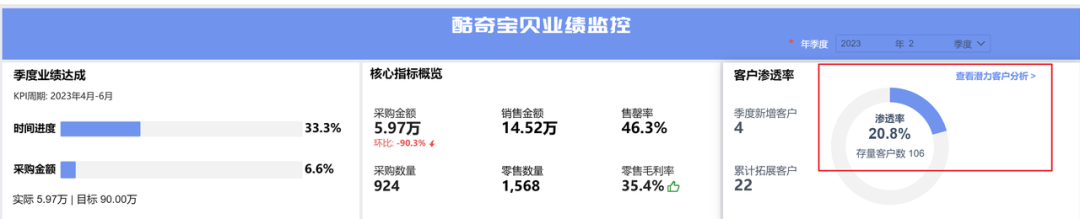 从整体业绩看,截止2023年5月1日,存量客户106名已渗透22名,2023Q2采购金额5.97万,KPI达成进6.6%,切换查看上季度数据,2023Q1的KPI达成94.3%,由此可见本季度的KPI设定相对合理。 -