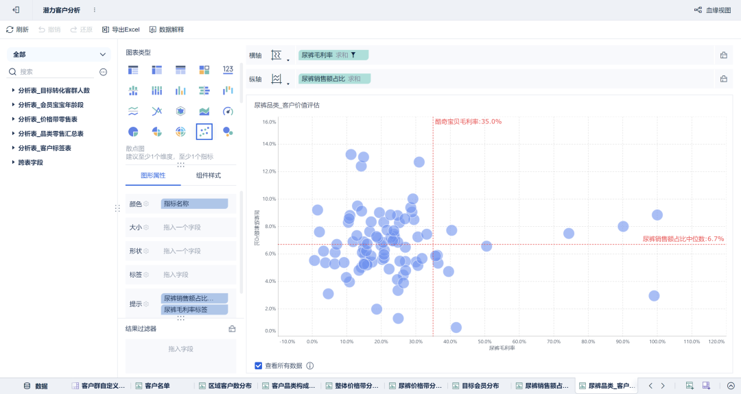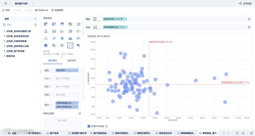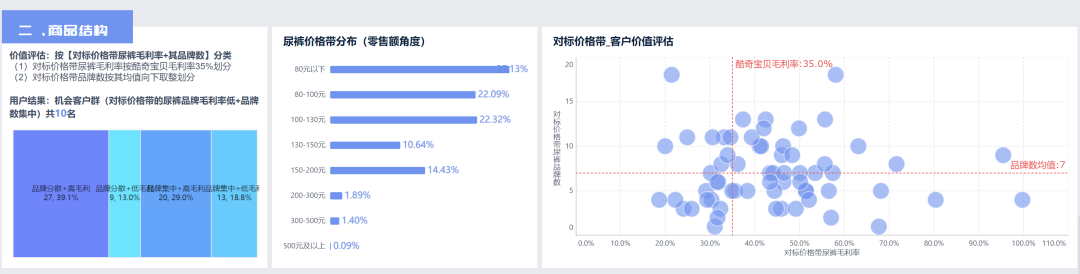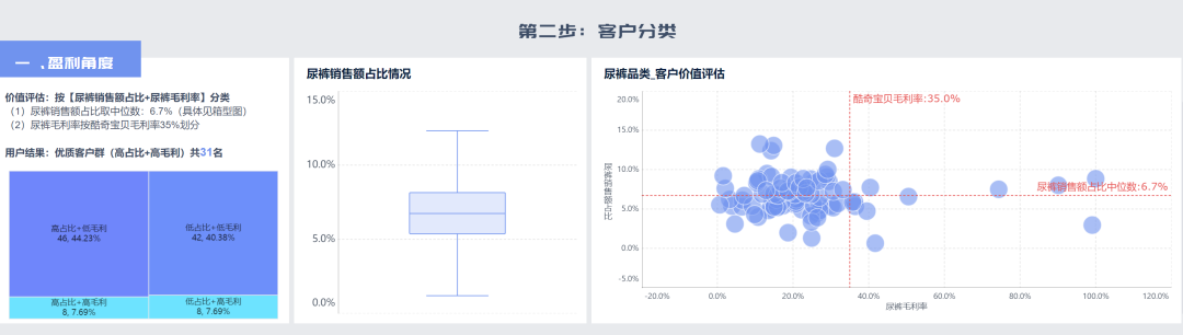 看品牌对客户经营有提升机会,尿裤销售额高占比+低毛利的客户可从转牌角度出发,替换成酷奇宝贝,提升其营收,该类客户定义为优质客户群,共31名。