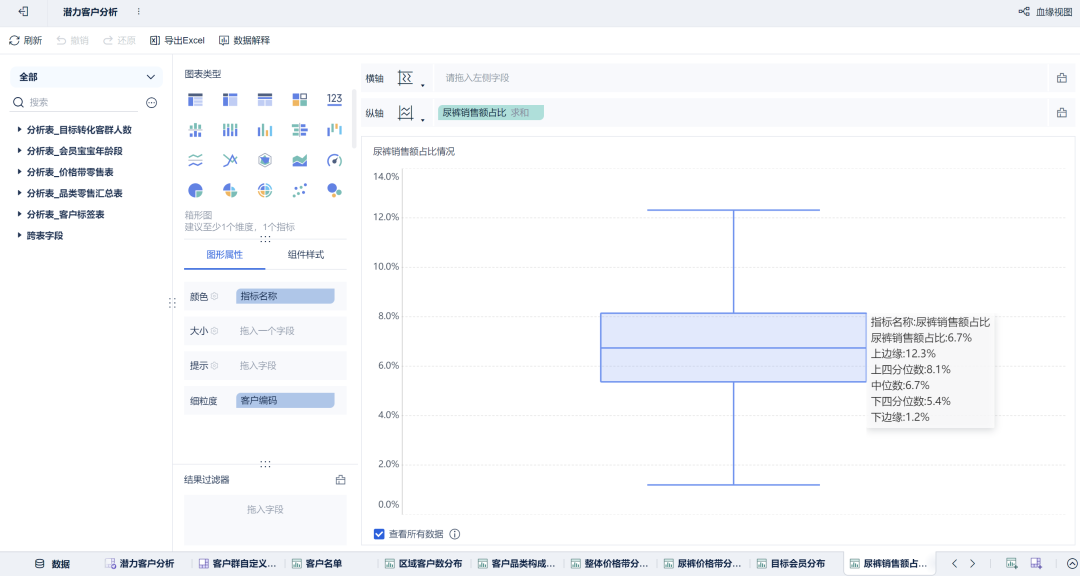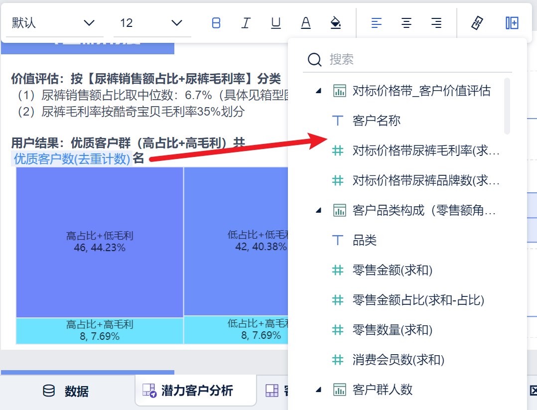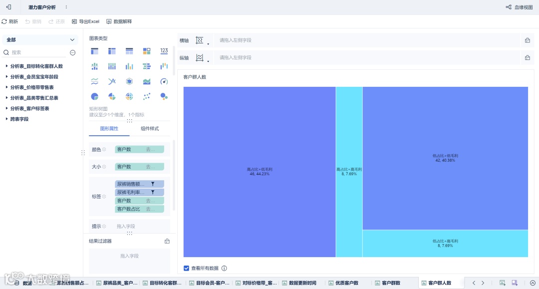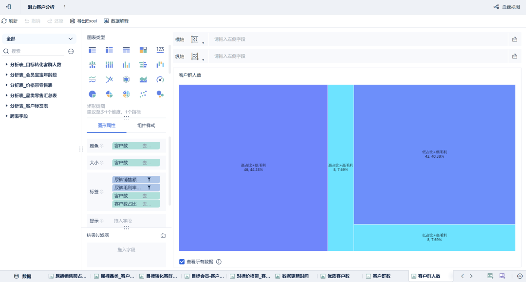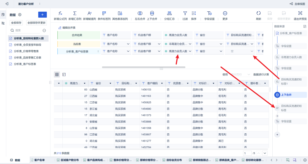 上下合并客户标签表,将【非高潜力会员人数】和【高潜力会员人数】上下合并,作为【目标转化客群人数】字段。 -