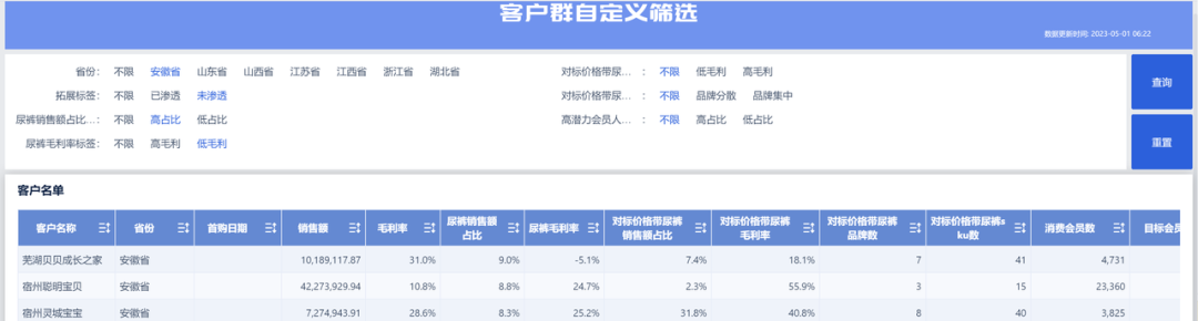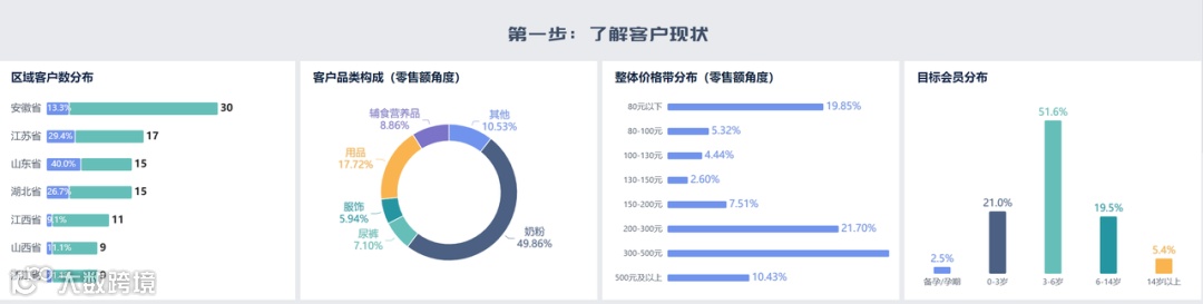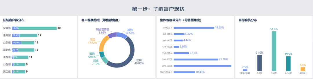 存量客户中,尿裤品类销售额占比7.1%(各区域负责人可点击省份取查看对应省份数据),目标会员(宝宝年龄0-3岁)占比21%