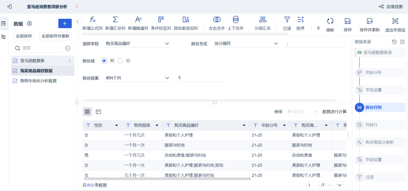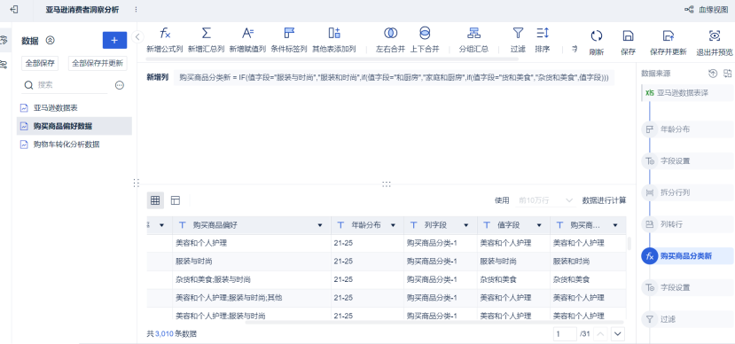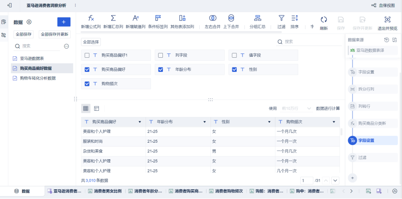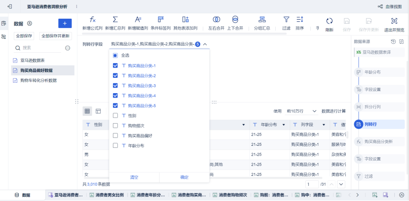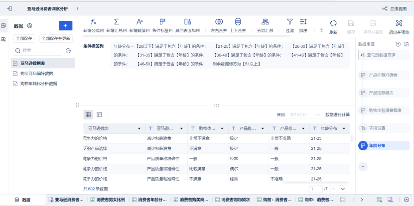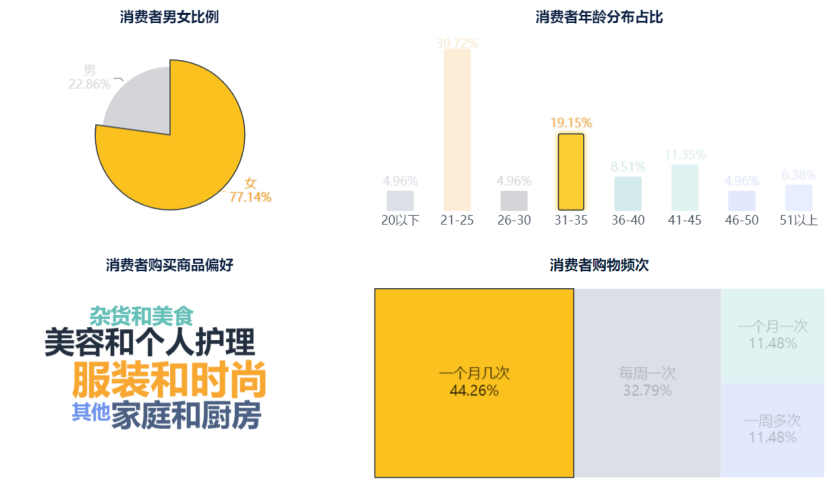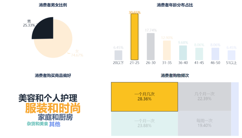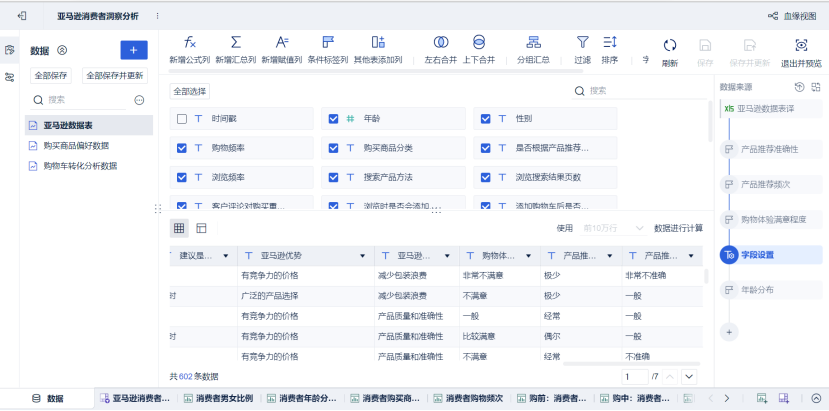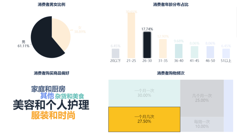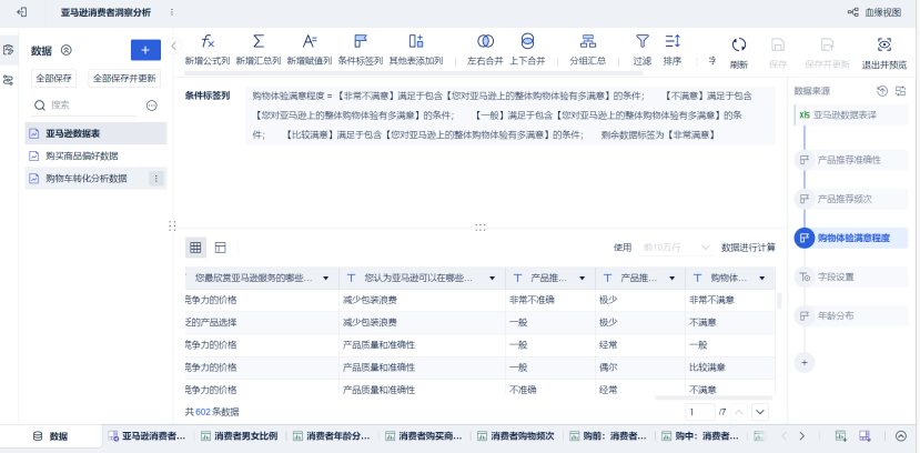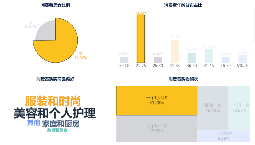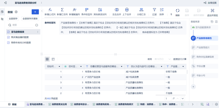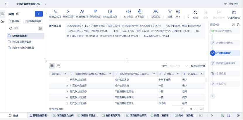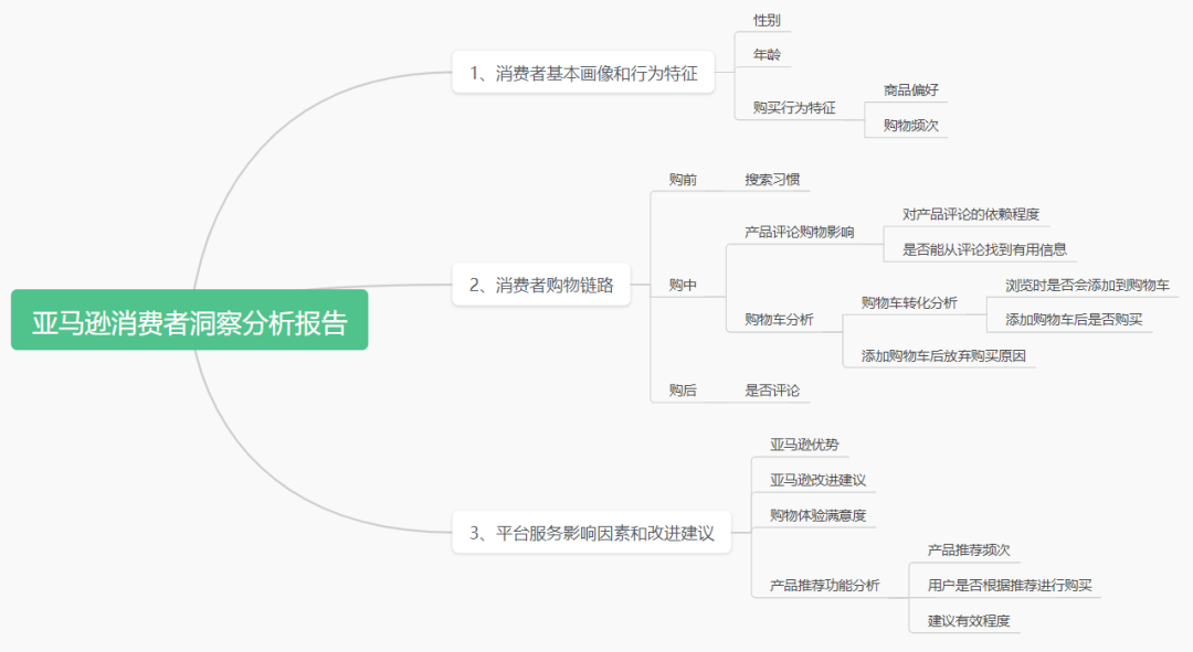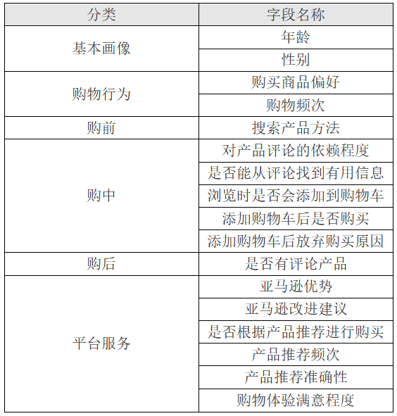 自选数据:和鲸社区。数据表为亚马逊消费者调研问卷,作品使用到的内容有(字段名称已重命名):