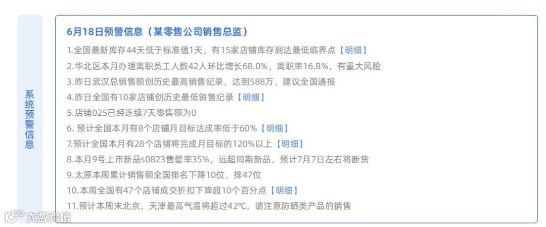 一款好的数据产品必须要具有自我诊断功能,它可以从不同维度、不同场景主动预警,提醒管理者经营中的各种异常状况, 一句话就是要足够智能。当数据自己会说话时,这不但可以提高管理效率,还可以使管理更立体,相当于管理者多了一双眼睛。