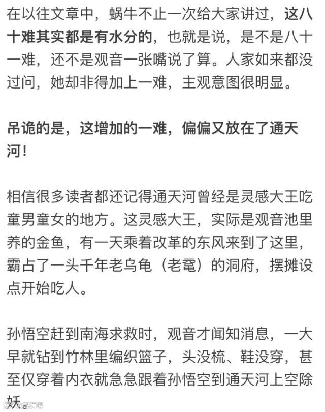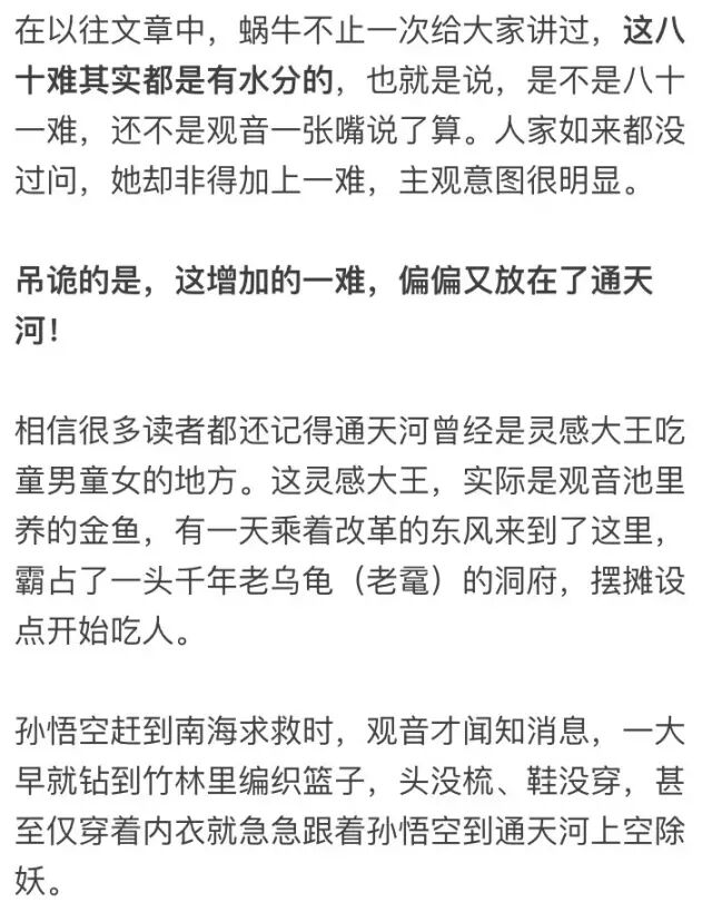 蜗牛认为,这第八十一难,观音不仅是在考验唐僧,更是在度老乌龟。因为这次除了让四人洗了个冷水澡、外加把经书打湿外,根本没遇到什么凶恶妖怪。这叫什么难?