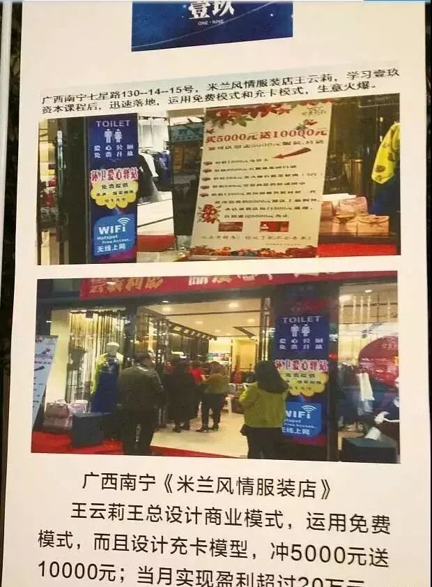 2:服装行业—广西南宁《米兰风情服装店》七星路130—14,15号,服装店老板王云莉,学习壹玖免费商业模式后,就实行落地,开设免费公厕和免费WIFI,而且设计充卡模型,充5000元送10000元产品,当月实现盈利超过20万元。