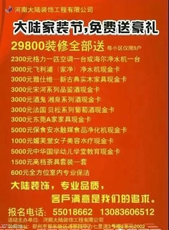 7:装饰工程行业—河南大陆装饰工程有限公司在给顾客保证品质的情况下还免费送礼品,实行“你装修,我付钱”的豪华大礼包,不是你看错了,是真的已经在盈利了!!!