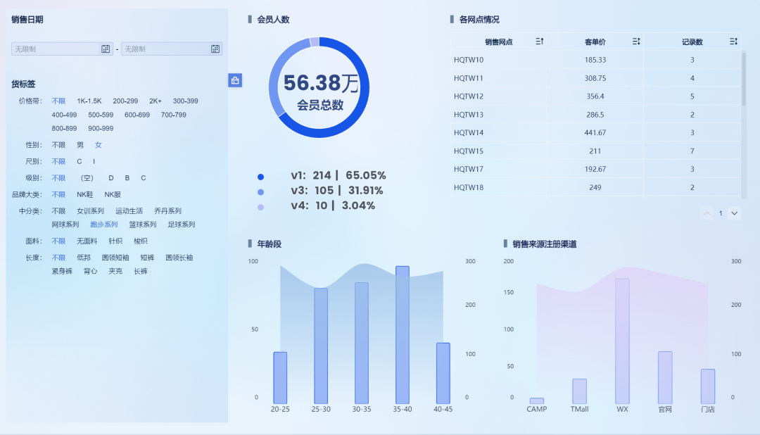 例如,以上方看板为例,当我预设明年期望投放市场的商品是一套面向女士的跑步系列的运动鞋服产品,那么我们可以从看板中发现其主要的客群集中在:“25-40岁的消费人群,且消费能力最高可达600的客单价,且主要来源渠道是微信小程序的入口”,这样我们就可以获得一个相对明确的预期客群画像。