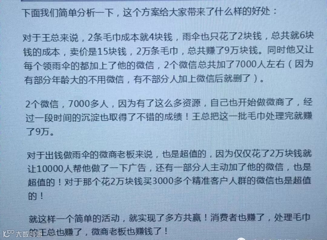 他找到一个做微商的朋友,因为做微商也是需要客源的,特别是宝妈客源,王总的资源正好是他朋友需要的,所以,他就让他做微商的朋友拿2万元,定制了1万把雨伞,雨伞上打上做微商朋友的广告,印上他朋友的二维码。