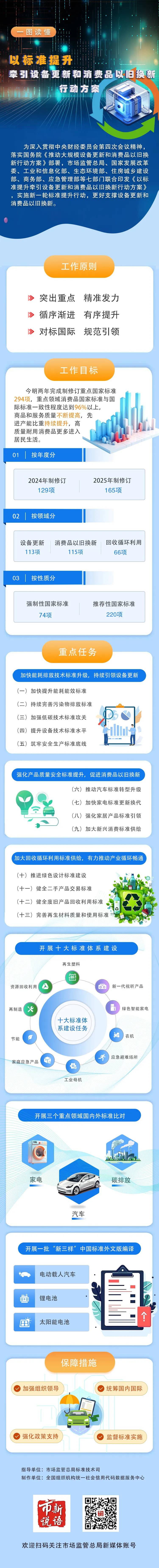 近日,市场监管总局、国家发展改革委、工业和信息化部、生态环境部、住房城乡建设部、商务部、应急管理部七部门联合印发《以标准提升牵引设备更新和消费品以旧换新行动方案》(以下简称《行动方案》),就贯彻落实中央财经委员会第四次会议精神和《推动大规模设备更新和消费品以旧换新行动方案》作出具体安排,提出实施标准提升行动,坚持标准引领、有序提升,强化标准比对、优化体系建设,加快制修订节能降碳、环保、安全、循环利用等领域标准,到2025年共完成重点国家标准制修订294项,有力支撑设备更新和消费品以旧换新。