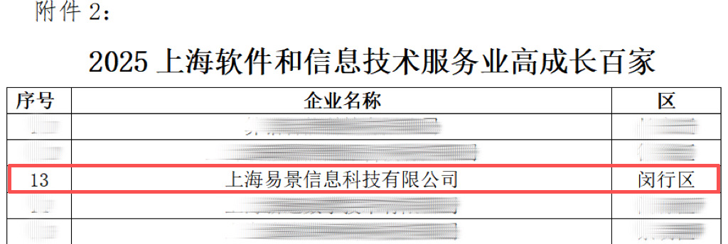 近日,上海市经济和信息化委员会正式发布了“2025上海软件和信息技术服务业高成长百家”企业名单,易景科技凭借近年来在软件和信息技术服务领域的卓越表现与快速成长,荣幸入选。此次评选,是对易景科技过去努力的高度认可,更是对我们未来发展潜力的充分肯定。