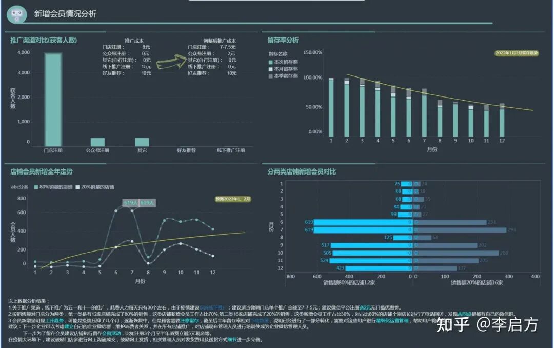 作者用对照法分析了新增会员的情况,首先对比了获客渠道和留存率分析,统计出店铺会员新增全年走势,最后按照店铺分类对比两类店铺新增会员对比,如下图所示。