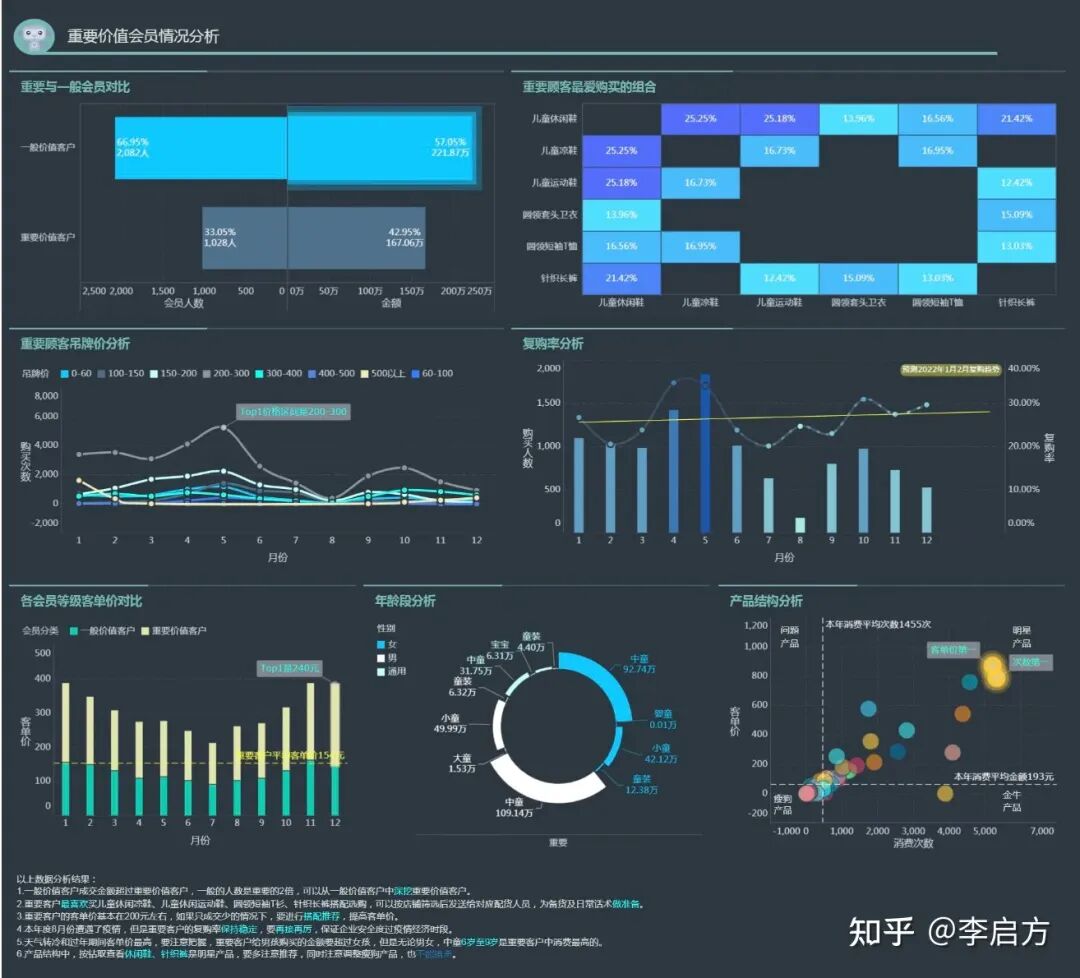作者通过选出重要价值会员与一般会员对比,重要客户的最爱购买组合,重要客户吊牌价分析,复购率分析,各会员等级客单价对比,年龄段分析和产品结构分析,如下图。