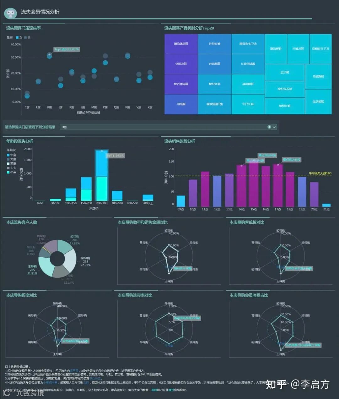 最后重点分析流失顾客门店流失率,流失顾客产品类别分析Top20,年龄段流失分析,流失销售时段分析,如下图