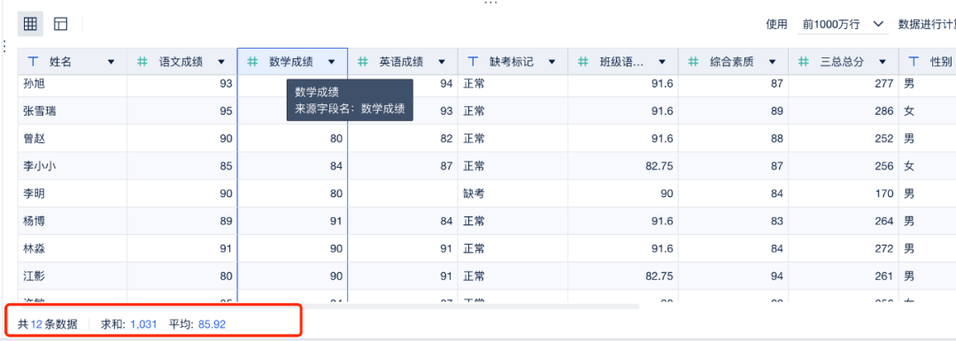 数学成绩字段校验得出平均分85.92,符合班级历史平均水平
