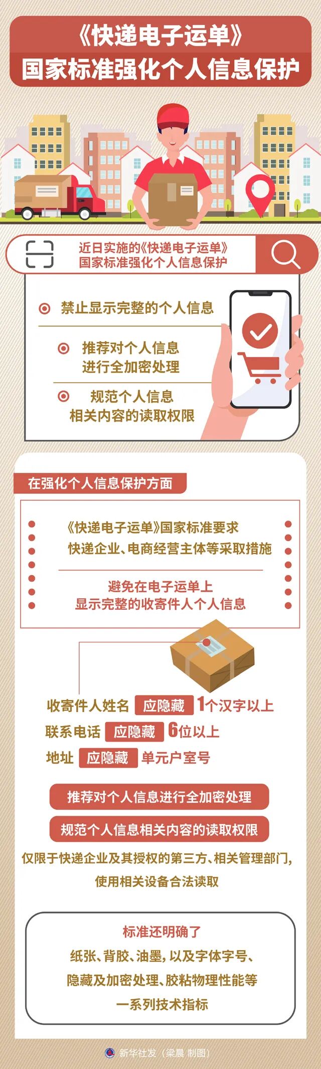 导读:近日实施的《快递电子运单》国家标准强化个人信息保护,禁止显示完整的个人信息,推荐对个人信息进行全加密处理,规