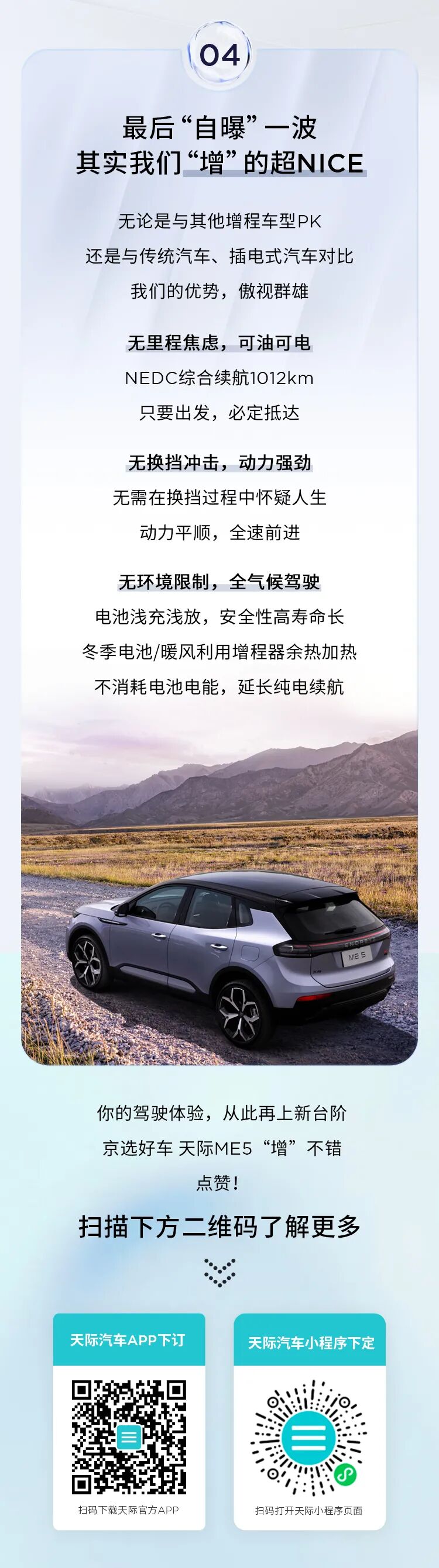 ENOVATE天际汽车,为大众造好车!增程式A+级SUV 京选好车天际ME5,NEDC续航1012km,售价13.88万元起;五屏互联智能纯电旗舰SUV 天际ME7,创新配备84项智能科技配置,售价23.88万元起。