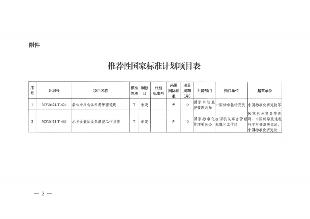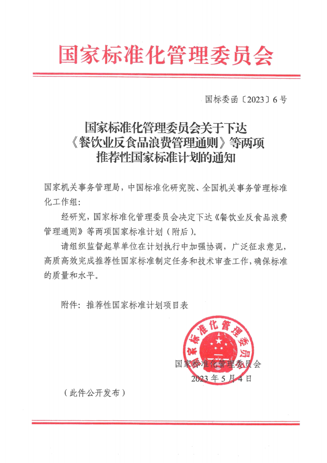 国家标准化管理委员会关于下达《餐饮业反食品浪费管理通则》等两项推荐性国家标准计划的通知