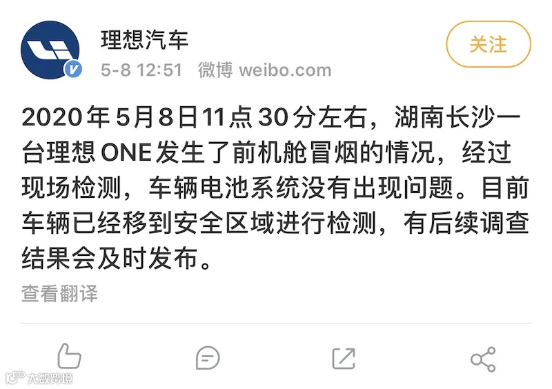 但从该自燃视频可以看出,冒烟的位置在机舱,也就是发动机(增程器)的位置,而位于底盘的电池组并未发生明显变化。理想汽车官方微博也特别说明,车辆电池系统并没有出现问题。