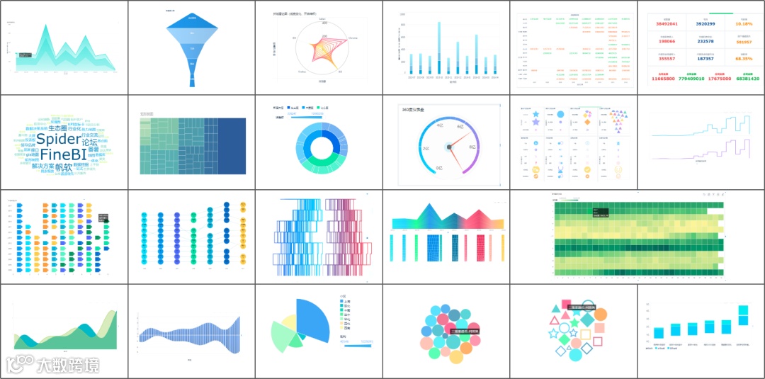传统工具如Excel,图表样式少、自由度小、不能联动,早已不能适应数据分析师们细分且复杂的展示要求。之前提到的 FineBI 就提供强大的可视化效果,内置了超多精美图表样式(如上图),不仅支持常用的柱形图、折线图、饼图、雷达图、气泡图、热力地图、GIS地图,还支持第三方图表插件,图表间还能进行联动,支持上探下钻,效果惊艳。