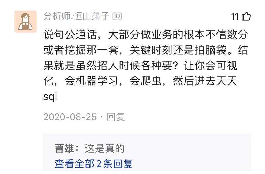 作为一个冲浪老司机,在网上冲浪、打嘴跑的时候,时常能看到数据分析师自嘲自己就是取数狗,即使自己会机器学习、会可视化、会爬虫编程,入职后依旧天天SQL。