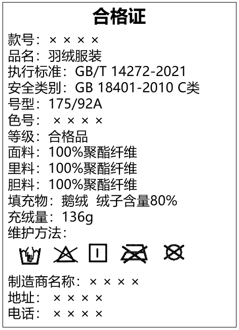 1.看合格证上的执行标准。执行标准为GB/T 14272—2021《羽绒服装》的产品,羽绒服的整体质量水平较执行2011版国标的产品,在羽绒品质、防钻绒性、羽绒的环保性能等方面会有显著提升。