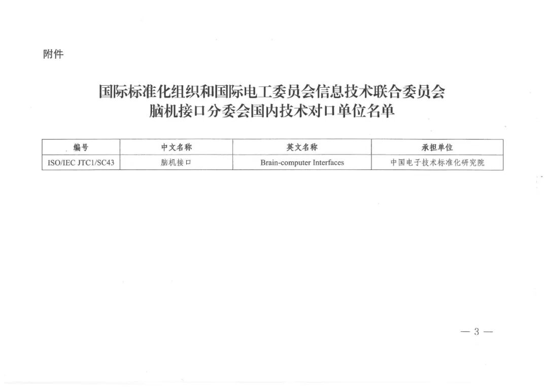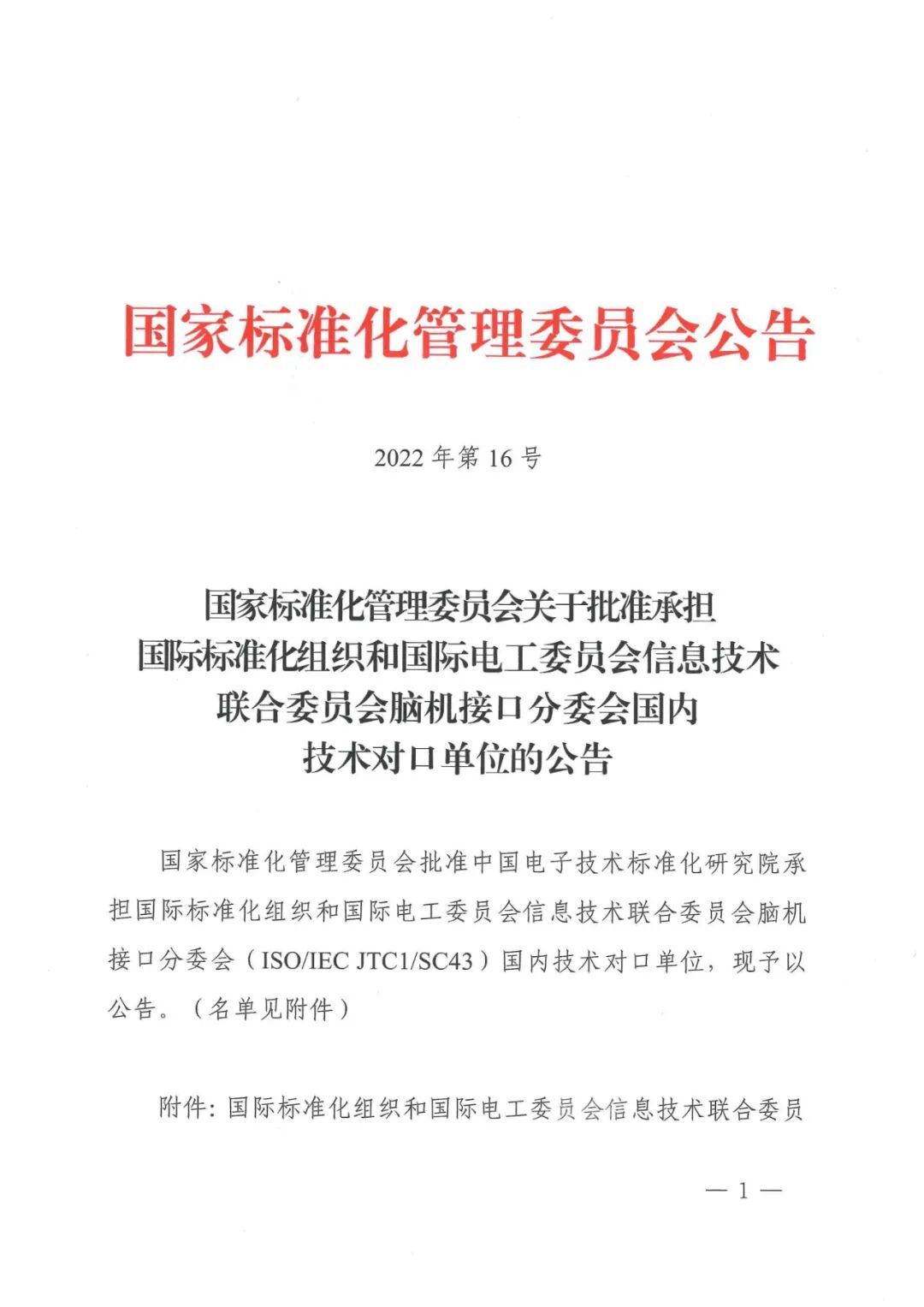 国家标准化管理委员会关于批准承担国际标准化组织和国际电工委员会信息技术联合委员会脑机接口分委会国内技术对口单位的公告