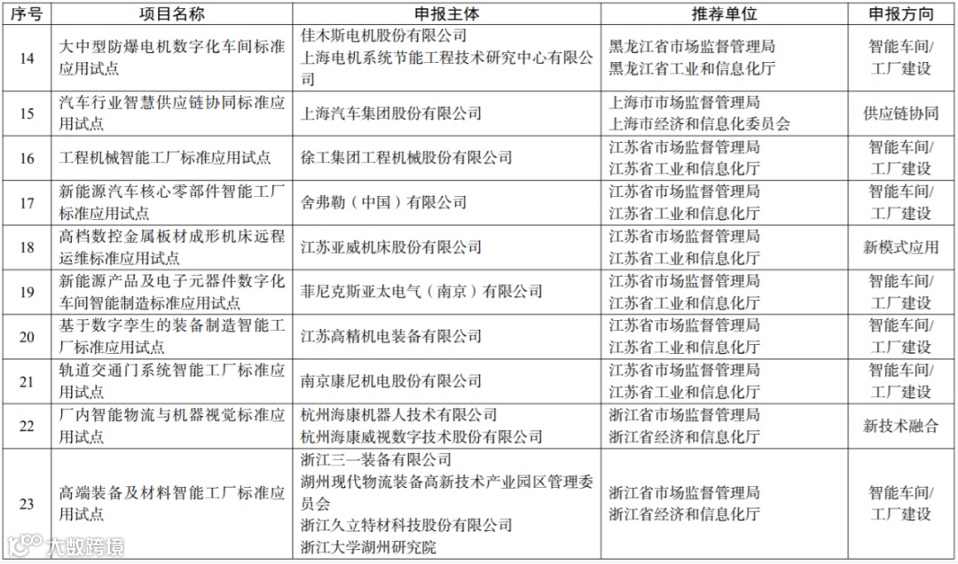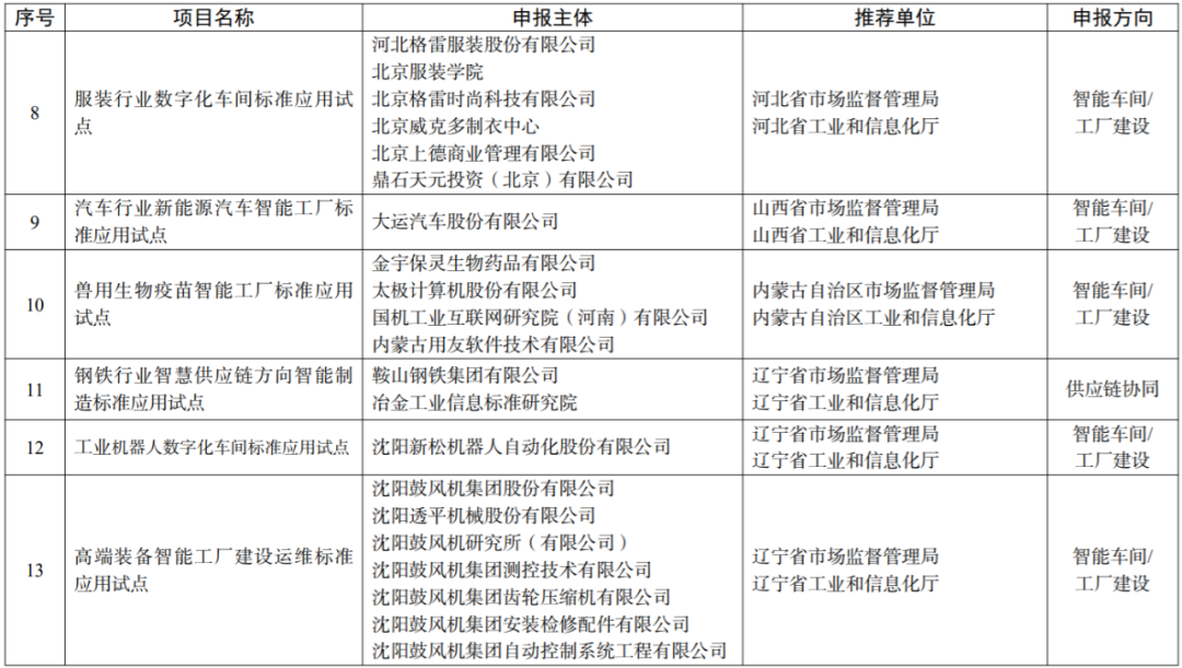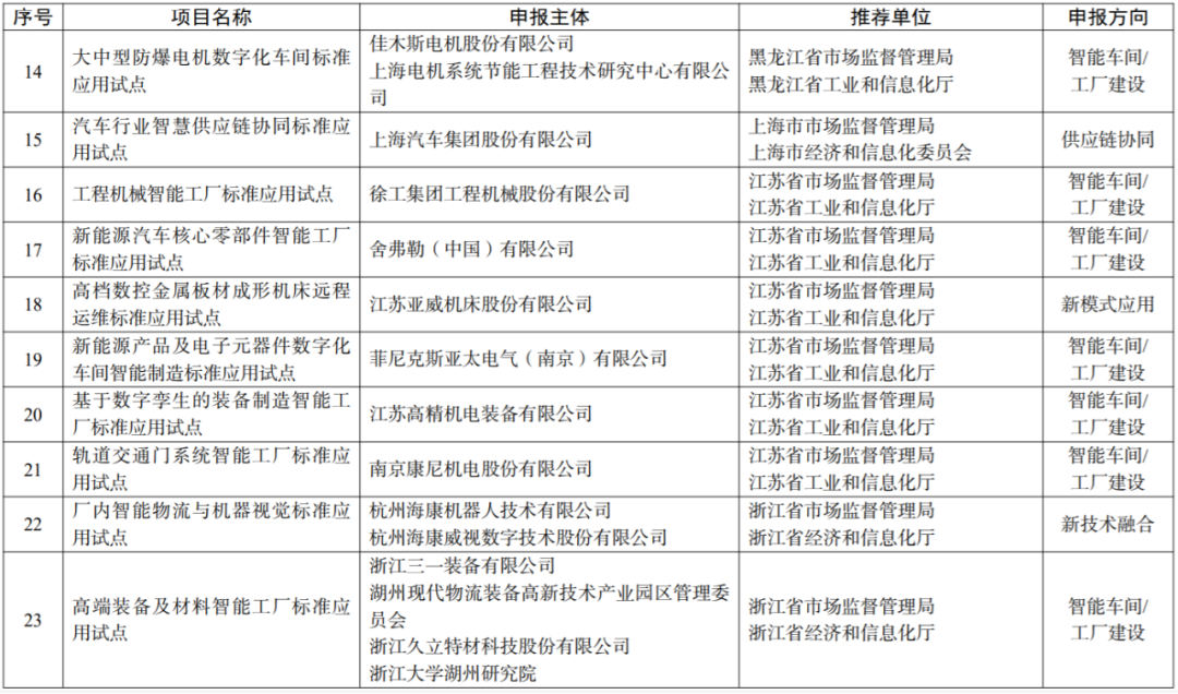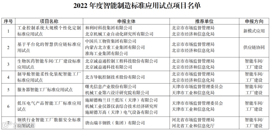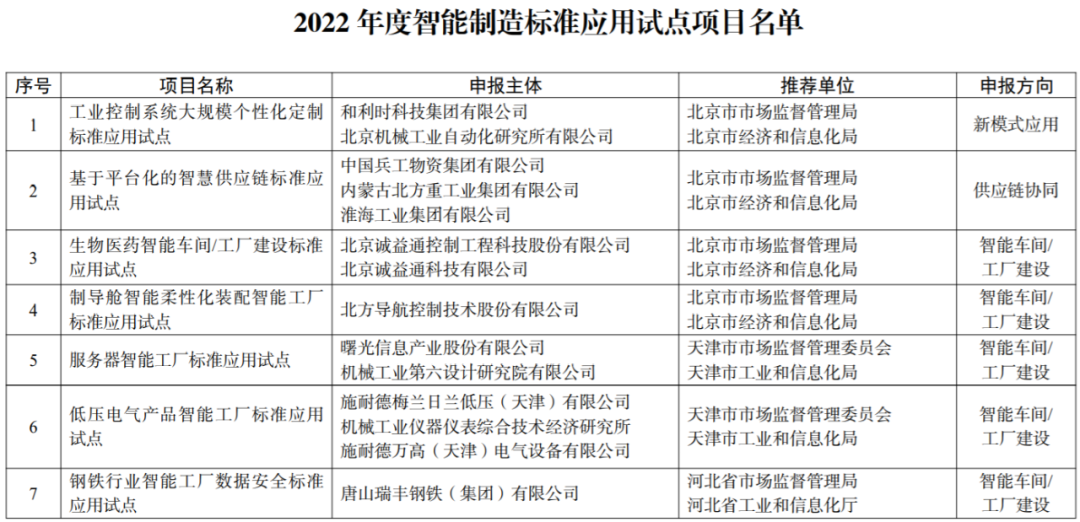根据《关于开展2022年度智能制造标准应用试点工作的通知》(市监标技发〔2022〕34号),现将拟入选的2022年度智能制造标准应用试点项目名单进行公示,请监督提出意见。如有异议,请在公示期内将书面意见反馈至市场监管总局标准技术司、工业和信息化部装备工业一司。