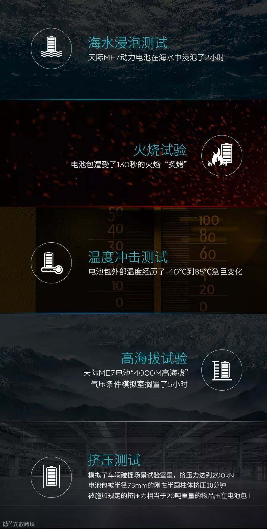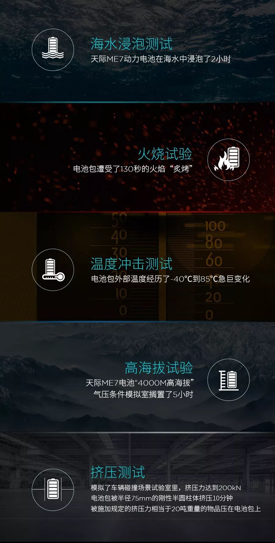 事无巨细的测试项目最大程度涵盖了动力电池所有使用场景,一旦发生任何异常,还有数据监控“防火墙”即刻触发与后台信息相连的车载 T-BOX ,启动警报保护人身安全。通过 300 项电池安全与性能测试,天际ME7刷新 B 级纯电 SUV 安全标准。