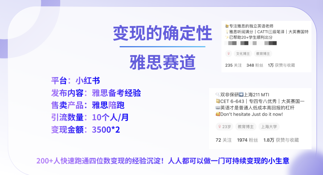 强背书赛道(用户想成为你):当你通过实践在某个领域取得显著成果后(如专升本逆袭名校、双非进大厂),你就可以开设“如何成为我”的课程或陪跑服务。你的个人经历就是最强大的信任背书。