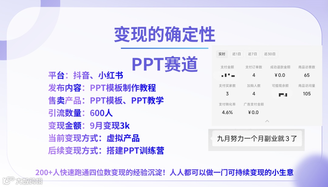 数学验证:(39元 * 100人)+ (2000元 * 3人) ≈ 1万元。这表明无需海量流量,只需服务好精准人群即可达成目标。