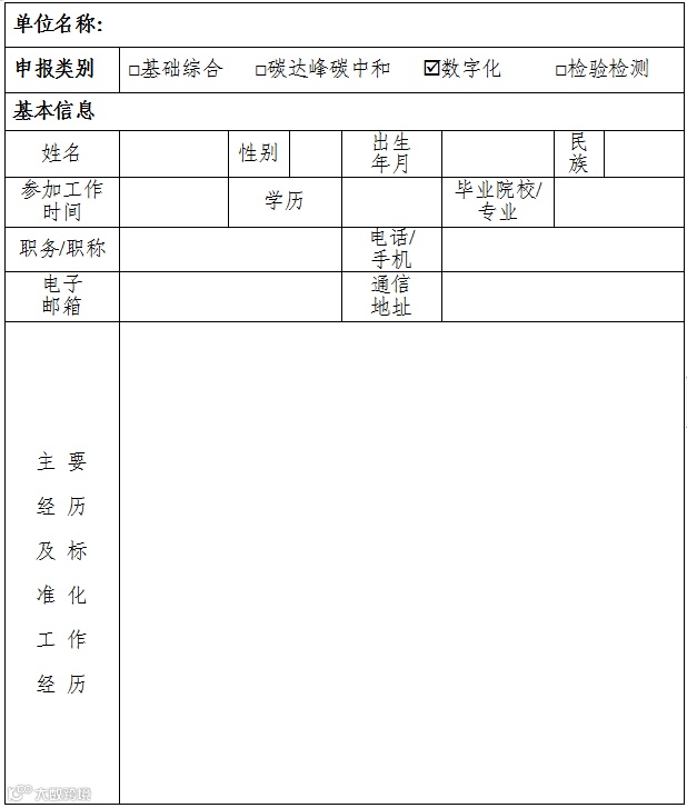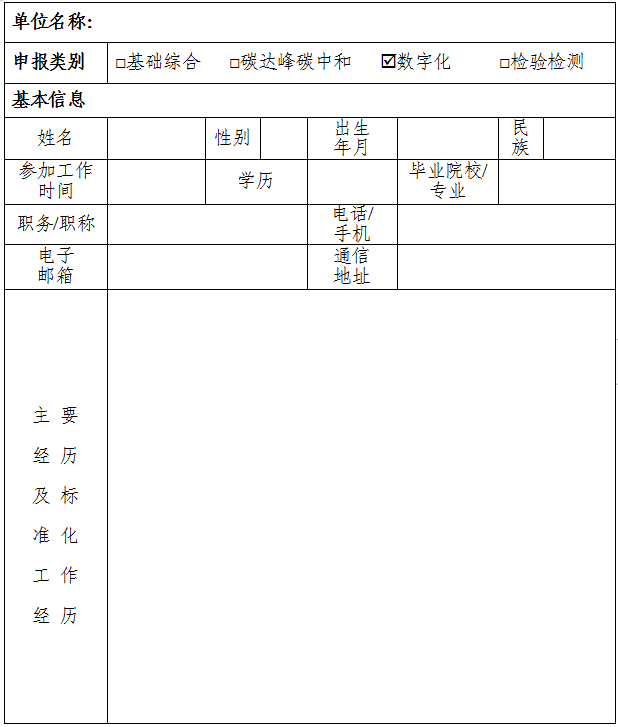 请各申报专家填写《标准化工作组成员推荐表》(见附件)并加盖单位公章,并于2022年6月28日前报送纸质和电子版专家推荐表(其中纸质版本通过邮寄方式报送,电子版本通过电子邮件报送)。