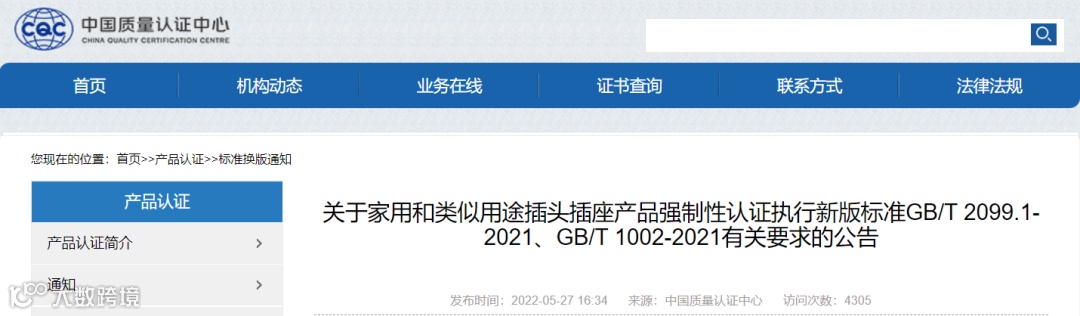 关于家用和类似用途插头插座产品强制性认证执行新版标准GB/T 2099.1-2021、GB/T 1002-2021有关要求的公告
