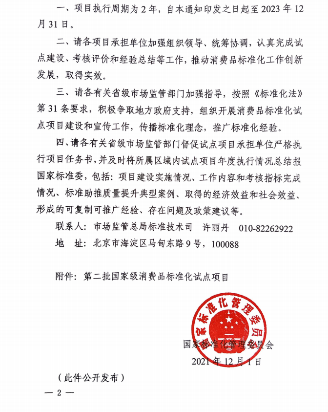 国家标准化管理委员会关于下达第二批国家级消费品标准化试点项目的通知