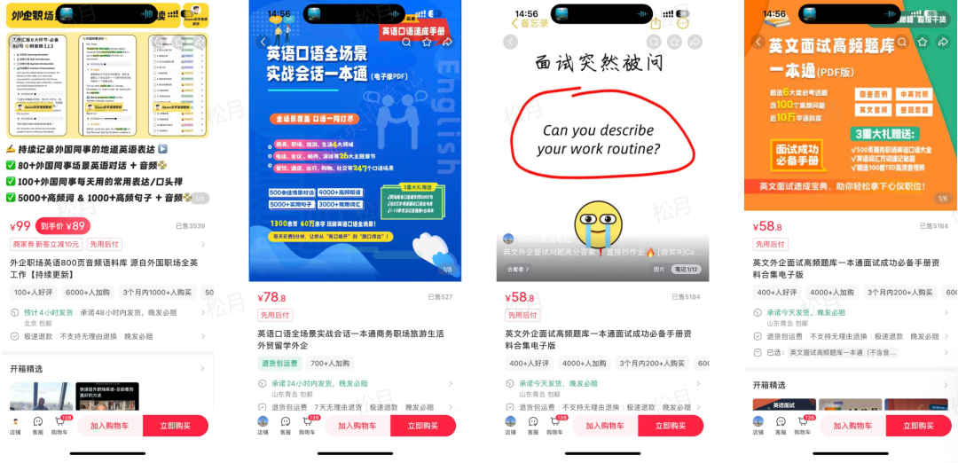 而容错率高的选品,是自己的店铺有一定的弹性,比如我举个例子;我选择卖外企面试题,假如说这个产品你最终出单情况不理想,你是可以有两个方向去探索的。