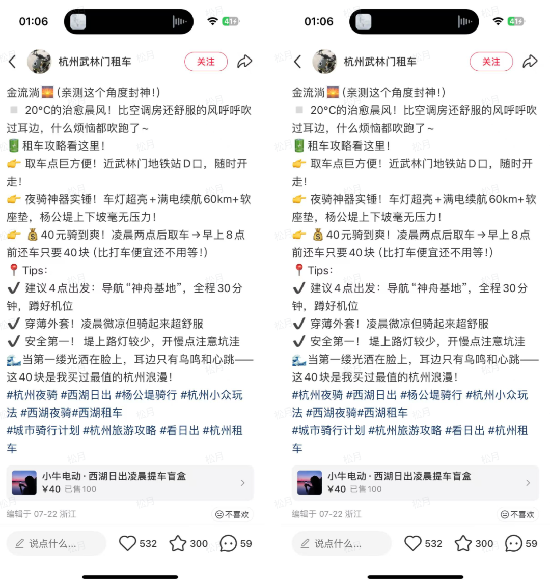 暑假的杭州很热门,在小红书也是网红城市,而最近流行凌晨四点到西湖看日出,而这个场景下就衍生出了骑电动车游西湖,但是大多数游客没有电动车怎么办?就有的商家做起了出租电动车的生意。